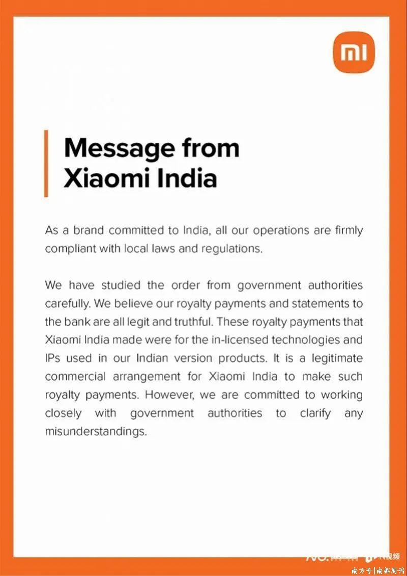 那时,小米印度公司发布声明称,算作一个英敢于印度的品牌,公司通盘运营行为齐严格效用当地的法律规律。小米印度默示,“咱们仔细征询了当局的敕令,咱们敬佩咱们向银行支付的特准权使用费和账单齐是正当且真确的。小米印度公司支付的这些版税均用于咱们印度版块居品中所使用的授权时期和常识产权。对小米印度来说,支付此类版税是正当的交易步履。虽然,咱们将与政府保抓密切合营,以清晰任何诬陷”。